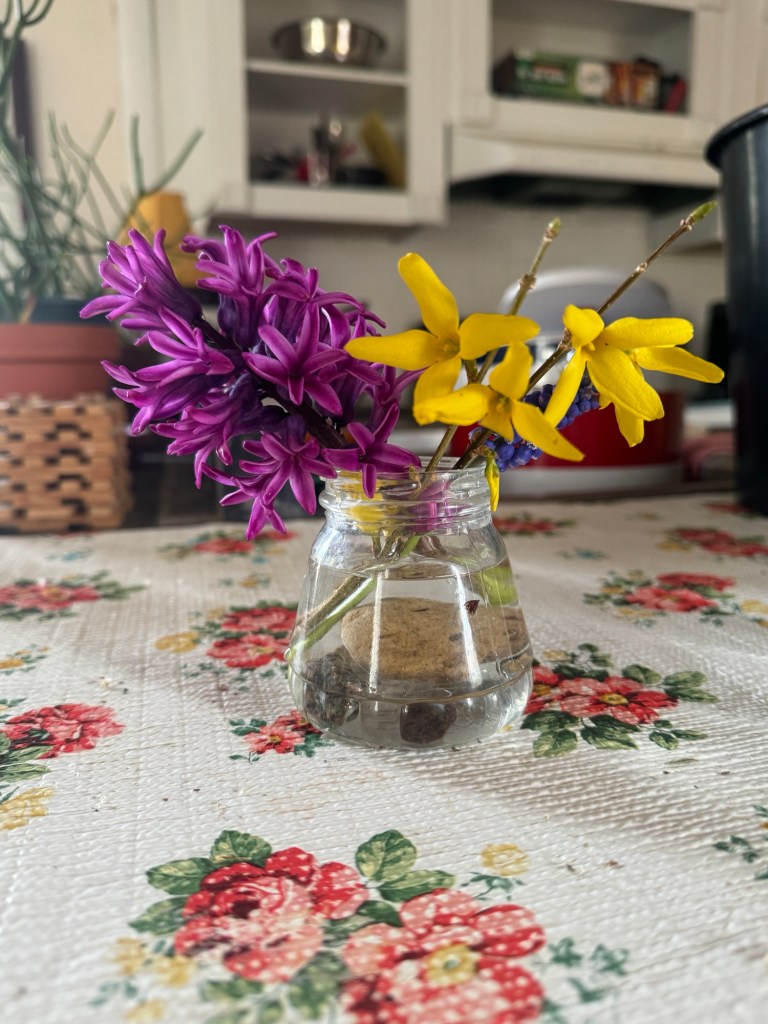 What is blooming: Hyacinth is popping up everywhere and forsythia is showing out. We are on tulip watch as they are looking nice and juicy. All 100 of them. I think next year we need 1000. Nanking cherries are waking up!