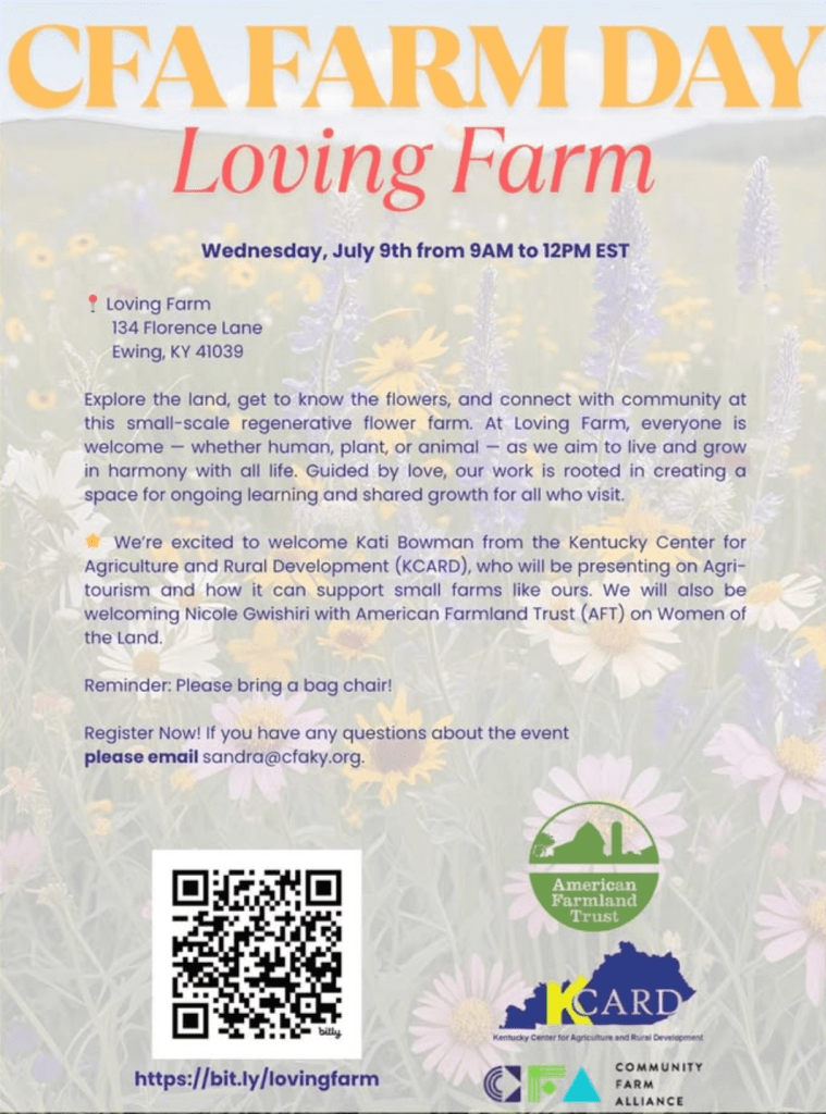 July 9th 2025: Community Farm Alliance (CFA) is coming to Loving Farm to talk with us about agrotourism, one of our favorite topics. Registration is open and participation is free of charge. The program will include a brief tour of our farm, followed by a presentation by Kati Bowman from KCARD to talk about ways to increase the success of agrotourism on Kentucky farms. Nicole Gwishiri will also be here representing American Farmland Trust. We are looking forward to hearing what they have to share with us! Feel free to share the links to this event from your socials or via email. It is open to anyone with an interest in this topic.
