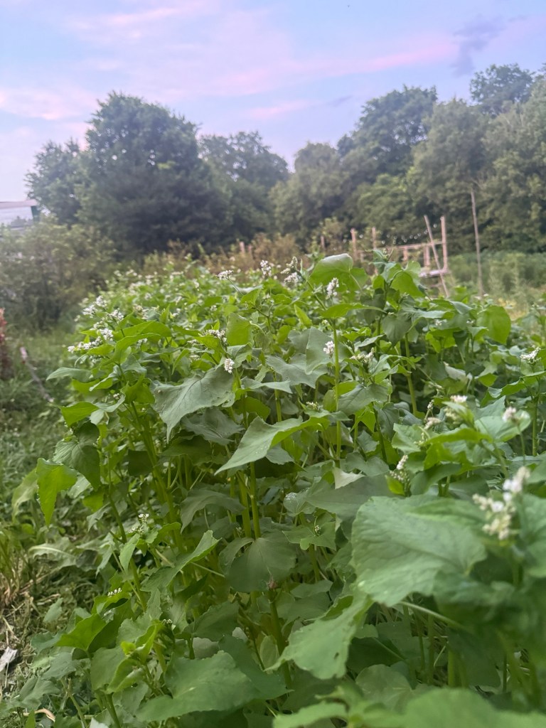 The topic of conversation around town this week has been all about rain and heat. We have had our share over the last several days and it looks like there is more to come. While laying awake at night itching from my poison whatever rash I have been afflicted with, I had a fun thought to expand our pollinator patch beyond the area we have planted (which looks pretty awesome so far). In light of the heat and rain, I thought we could try mowing down the grass around the existing goldenrod and sunchokes and other “keepers” and scatter a bunch of buckwheat seed to see if we can’t establish a good stand that we can naturally terminate (chemical free, of course), and plant some wildflower mix into it this coming spring. It might require an additional cover of crimson clover to get us into spring, but I think it could work! Why not take advantage of what Mother Nature is dealing out if we can? We have another nice stand of buckwheat going on a new patch of untilled ground behind the duck run that should be ready for something fun this fall.