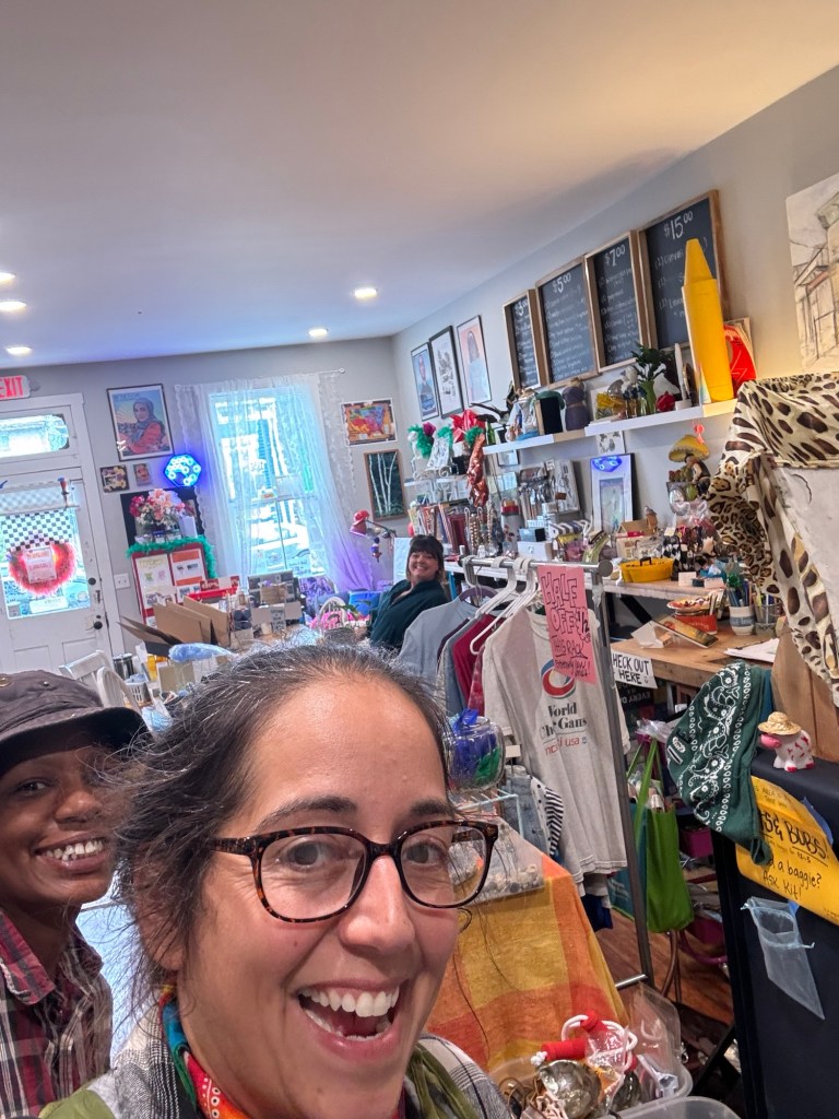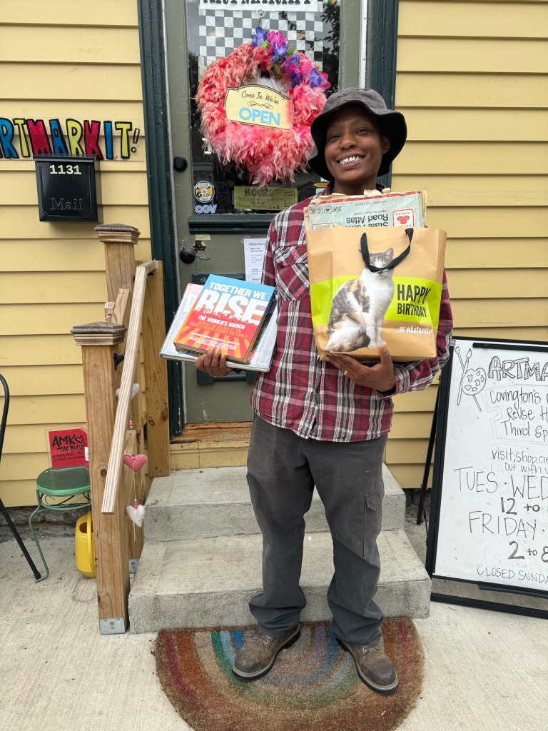 I was introduced to her store last week while visiting my friend who is moving out of Covington. While packing up, she gathered a big stash of her old arts and crafts supplies to donate to the store, including an array of gift bags that we got to choose from to take our finds home in when we stopped in to shop. Funny enough, we did not purchase anything art-supply related. I got the coolest house dress, two books, both hardcovers (one about the Women’s March which we both attended in 2017 with my sibling and the other about Kentucky with a forward by Wendell Berry), a couple of packs greeting cards, and an atlas that my friend had incidentally donated just days before. It was just a really great experience speaking with another business owner who also happens to be queer and navigating the world these days. She has curated a space that is obvious when walking in that it is really for every body. There is nothing more comforting then to see even the smallest rainbow flag on display when walking into a small business.