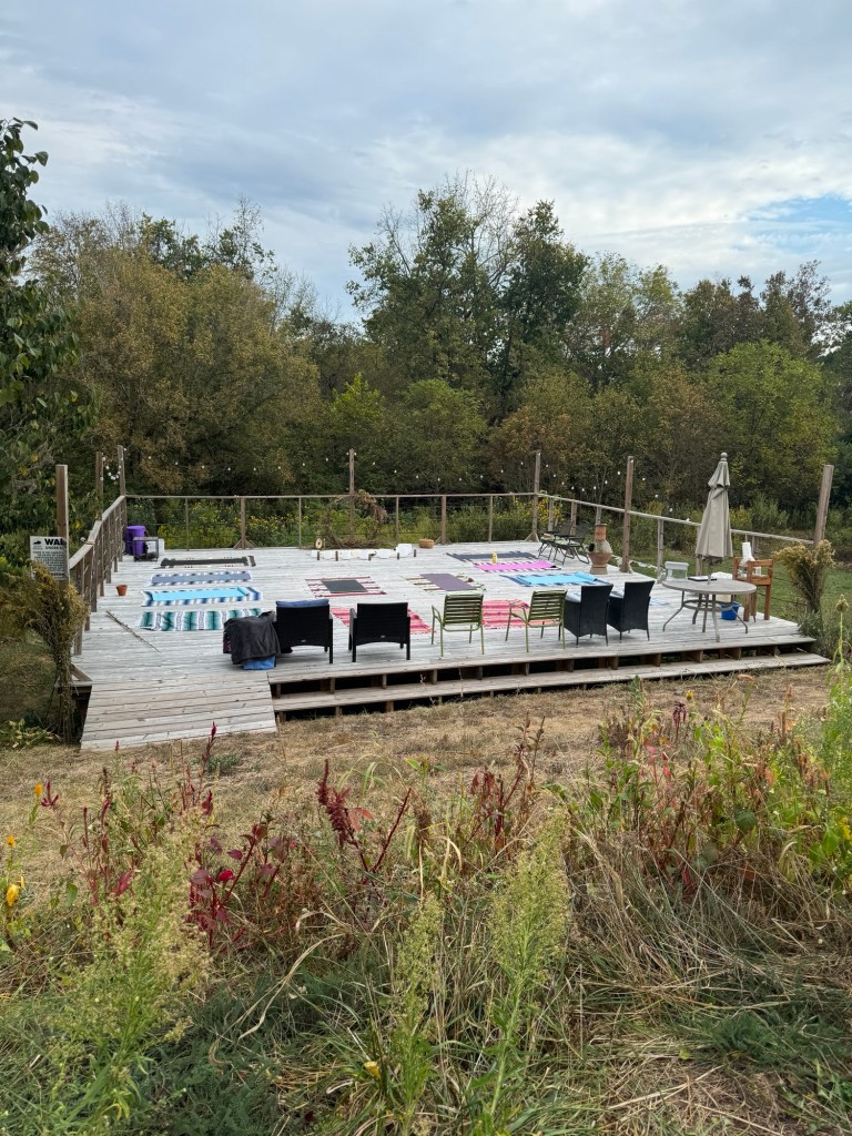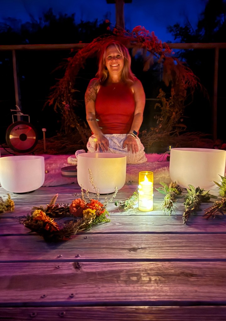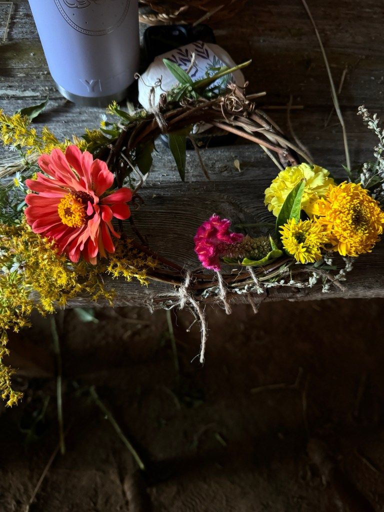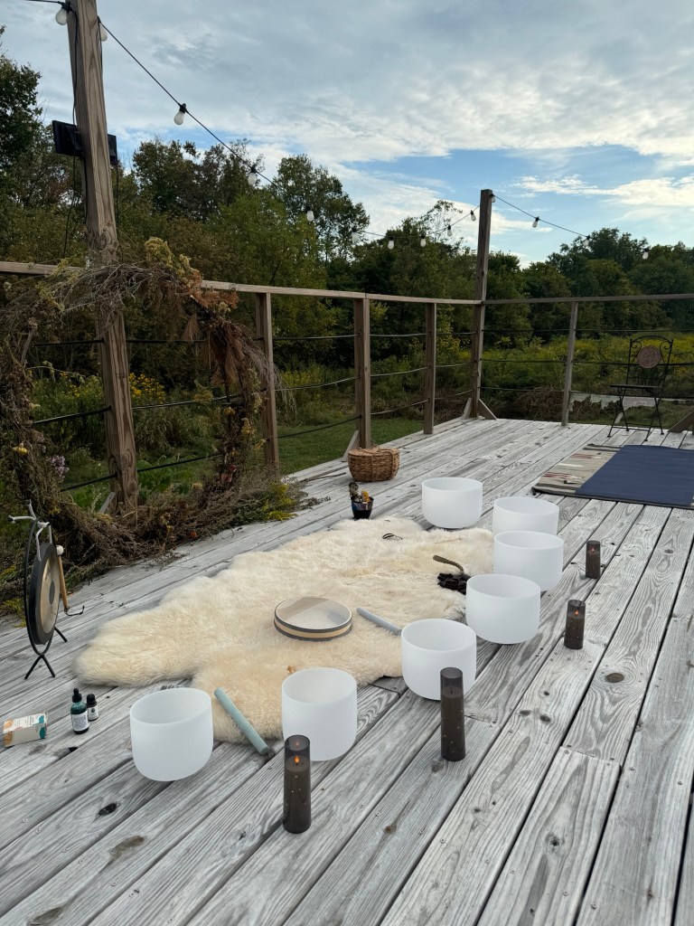 After finishing our wreaths, we moved to the deck where Kristen led us through the journey of sound in conjunction with the sounds of nature. We laid our flower art next to the bowls where they soaked up the direct reverberations of the auditory show. I laid on the mat I chose and watched the birds above who flitted around to join the trees and the sky appeared as a movie screen, bordered by the solar lights hung around the perimeter of the deck. As the sun set, I could not help but sit up to take in some of the evening sunset and then laid back down to listen to our ducks quacking nearby and the cows off in the distance. It was hard for me to quiet my mind and relax through it all, underscoring exactly the importance of being there…to slow down, but it was all just so lovely and restorative. We would love to do it all again!