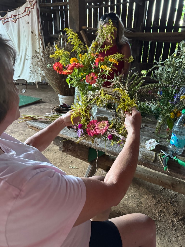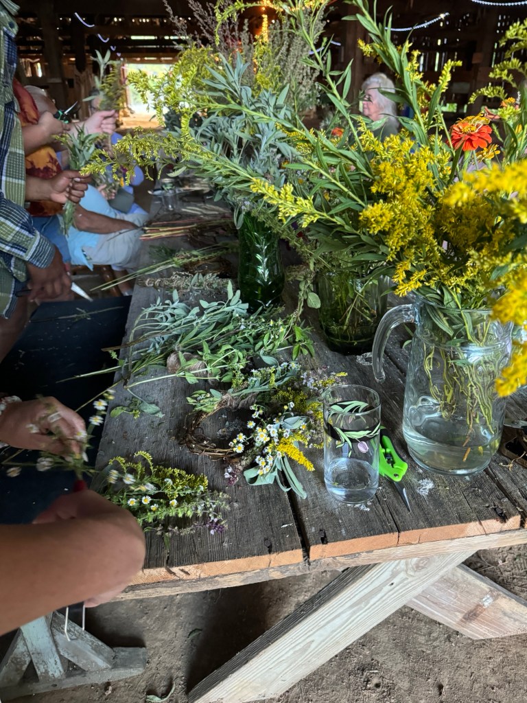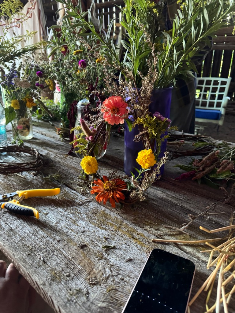 Let me tell you how beautiful our evening was last Sunday celebrate the Autumn Equinox with flowers and a sound bath on the deck. We kicked off the evening in the Warehouse where I did a very quick demo on how to decorate a wreath base and Perriee showed how to wrap a sage stick and then we let everyone dig in to the flowers (and snacks too). Although we were all getting acquainted during our crafting, there was a quiet calm in the room as everyone focused on the flowers. The smells of the herbs, the textures of the different plants, and the contrasting colors touched on so many of our senses.