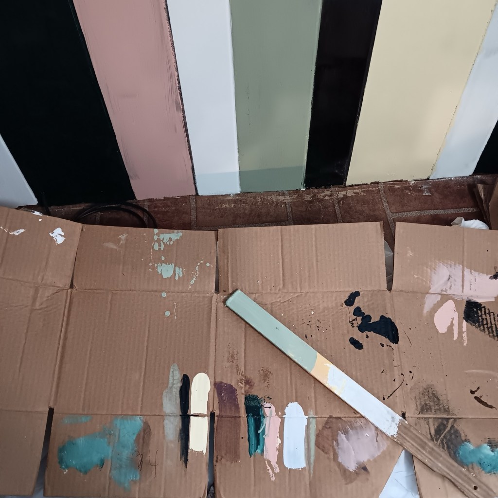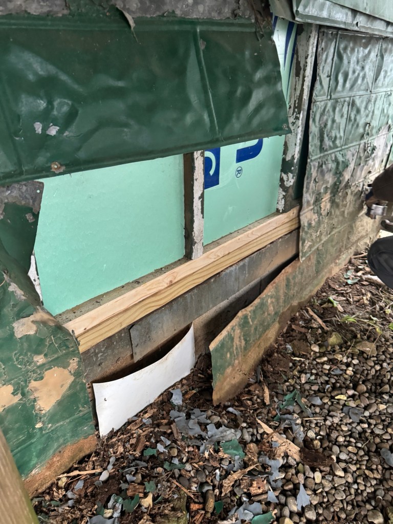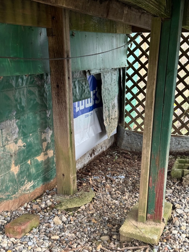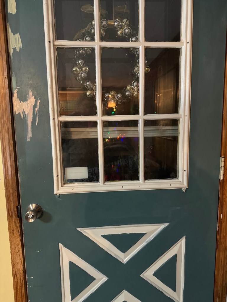 On the way out of the house, our guests will be met with our new, sleek paint job we completed on the exterior wall of the den which faces the duck run. Inspired by Banyan Bridges, we used a combination of our old paints to paint the wood paneling. After working on the room underneath it this week, and having re-framed and insulated the wall under the front deck, (with a temporary fix on the outside until we get the porch pulled off)we feel pretty good about leaving that wall intact in the den, planning on removing the paneling on the adjoining walls to peek behind for water damage those as we continue to update the room. Even the door got a refresh, being a mixture of the dark green and yellow paints. It is such a fun color now! The project did not require one new can of paint.