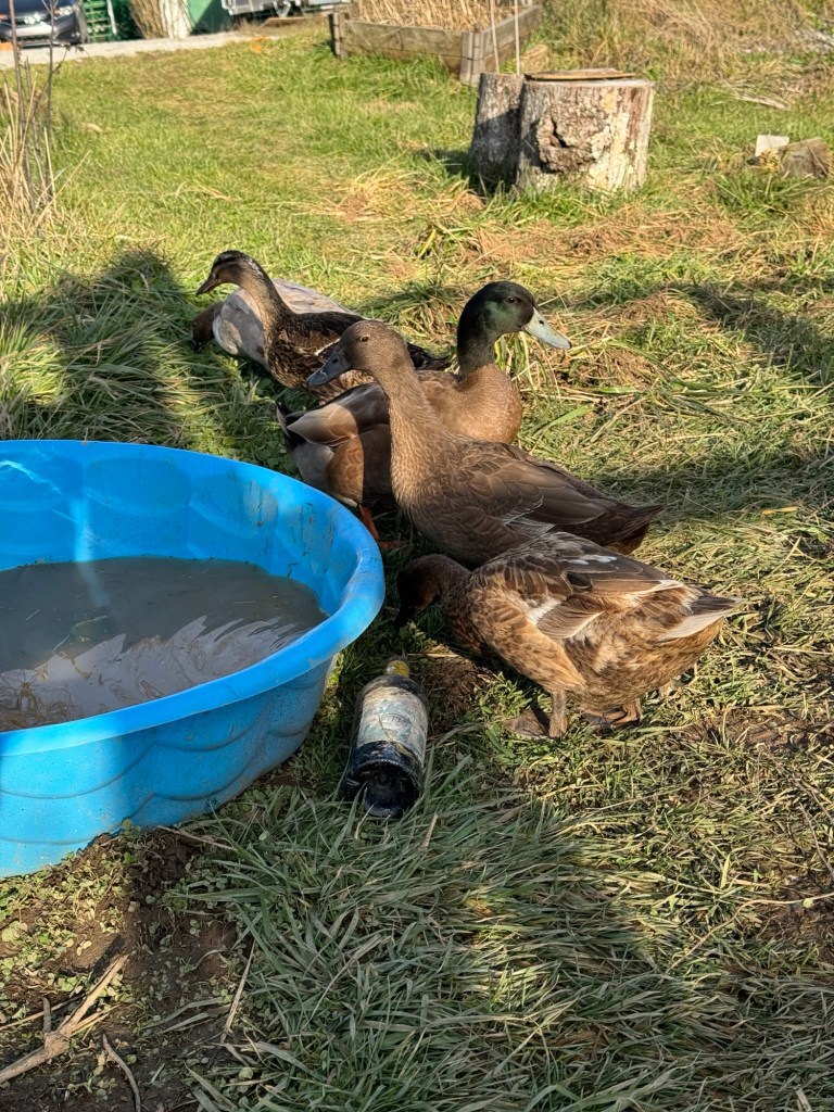 Mia the Rouen is the least shy of the three, with her little lazy eyelid that had us so worried last spring, thinking she had an infection. No, its just her eye. She makes it easy (for a duck- she isn’t jumping into your arms or anything) to care for her though, being pretty cool about picking her up and loving on her. Mamma is the smallest in body, largest in spirit, being the sassiest of the three. Another Khaki Campbell, she tolerates Howard the best and seems to be in charge of the little throuple. Baby, the white one, a Blue Swede we think, has the cutest crooked tail and is by far the most timid of the three. All of them are absolutely part of the family now and have added so much spice to our lives. Adopting affords more insight into temperaments and relationships and overall health which is hard to predict in ducklings. These ladies are the best!