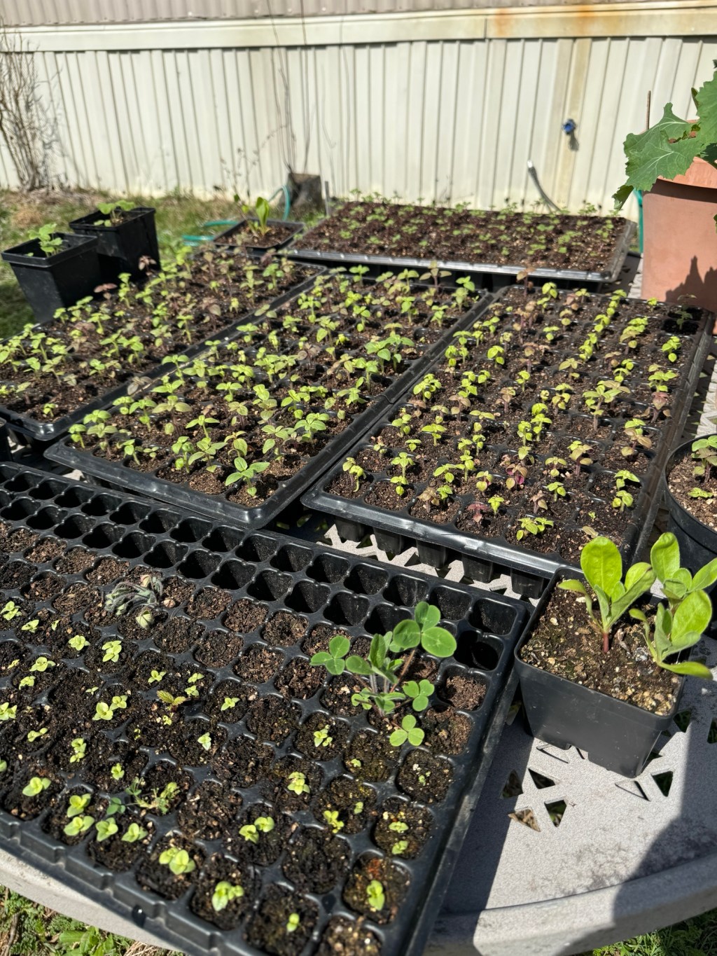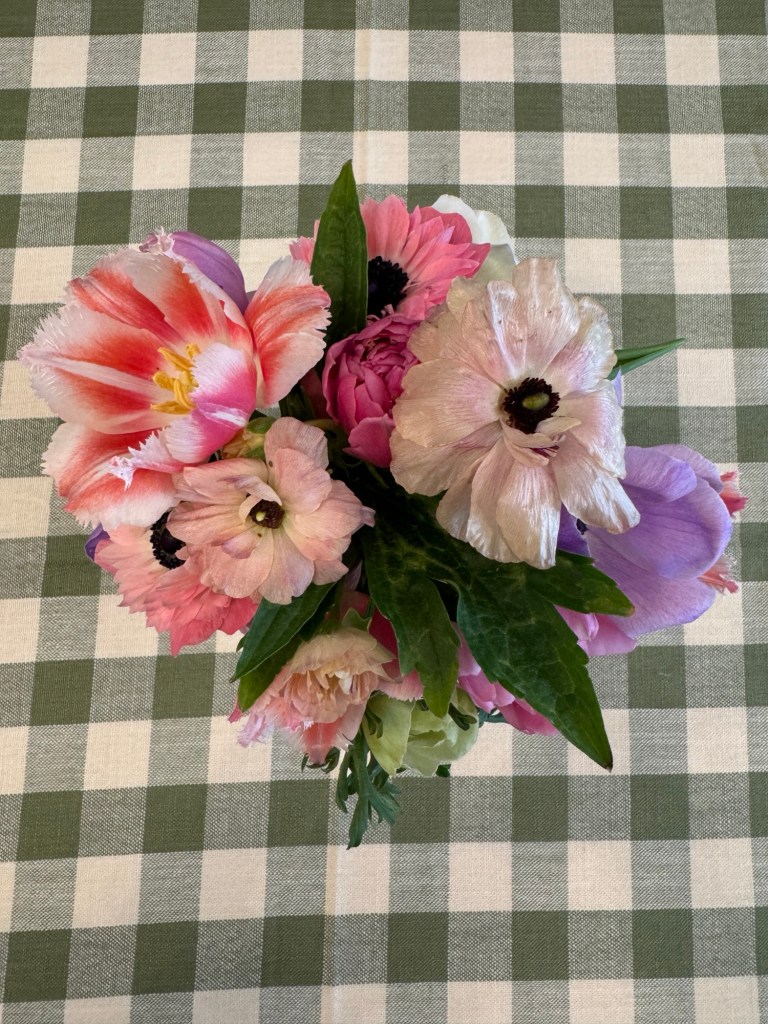 The greenhouse we purchased has a thermo-controlled exhaust fan in it which we tried out for the first time. It works really good considering the sun that hits the building which really heats it up. We just constantly move plants around depending on the time of the day, the weather conditions and temps. It helps me get my steps in. Most everything sleeps in the greenhouse, but we move the snapdragons, ranunculus, the most beautiful tray of kale we have ever grown, calendula, and lisianthus (all who want to say on the cooler side) outside on the metal table to catch the breeze and some lower digits.