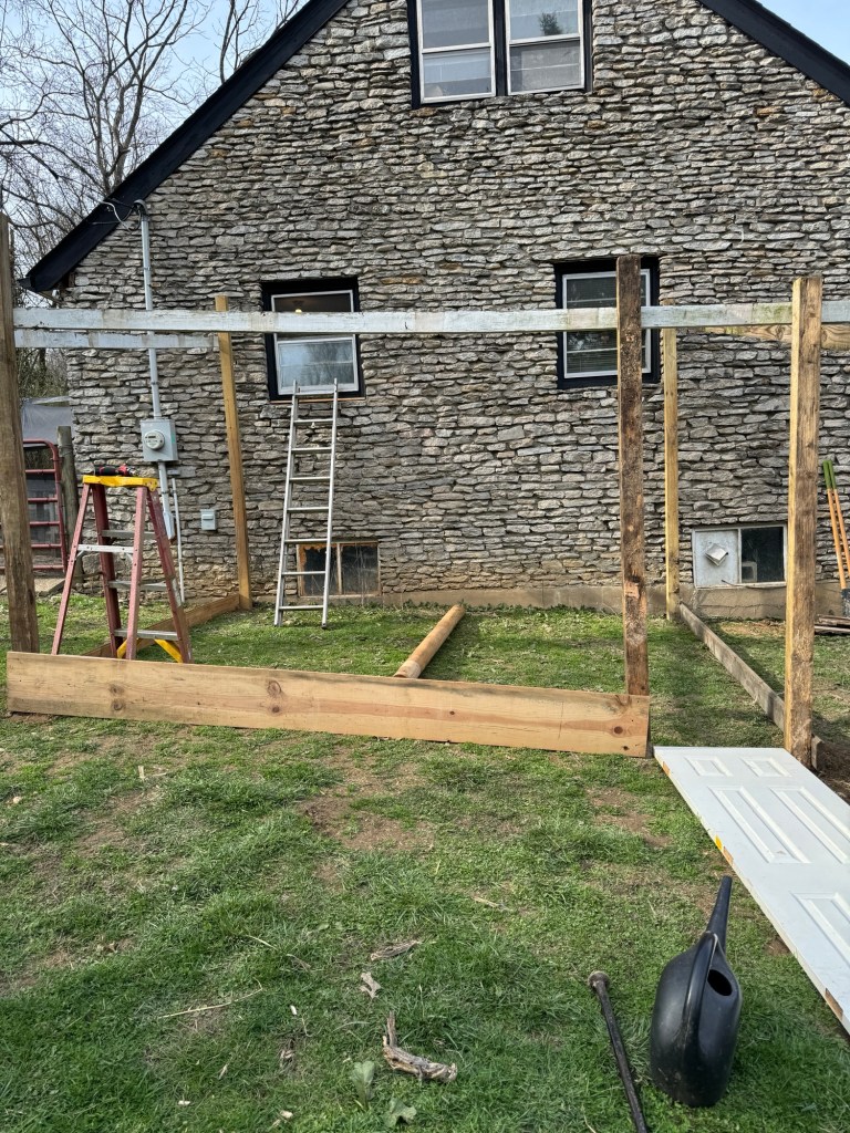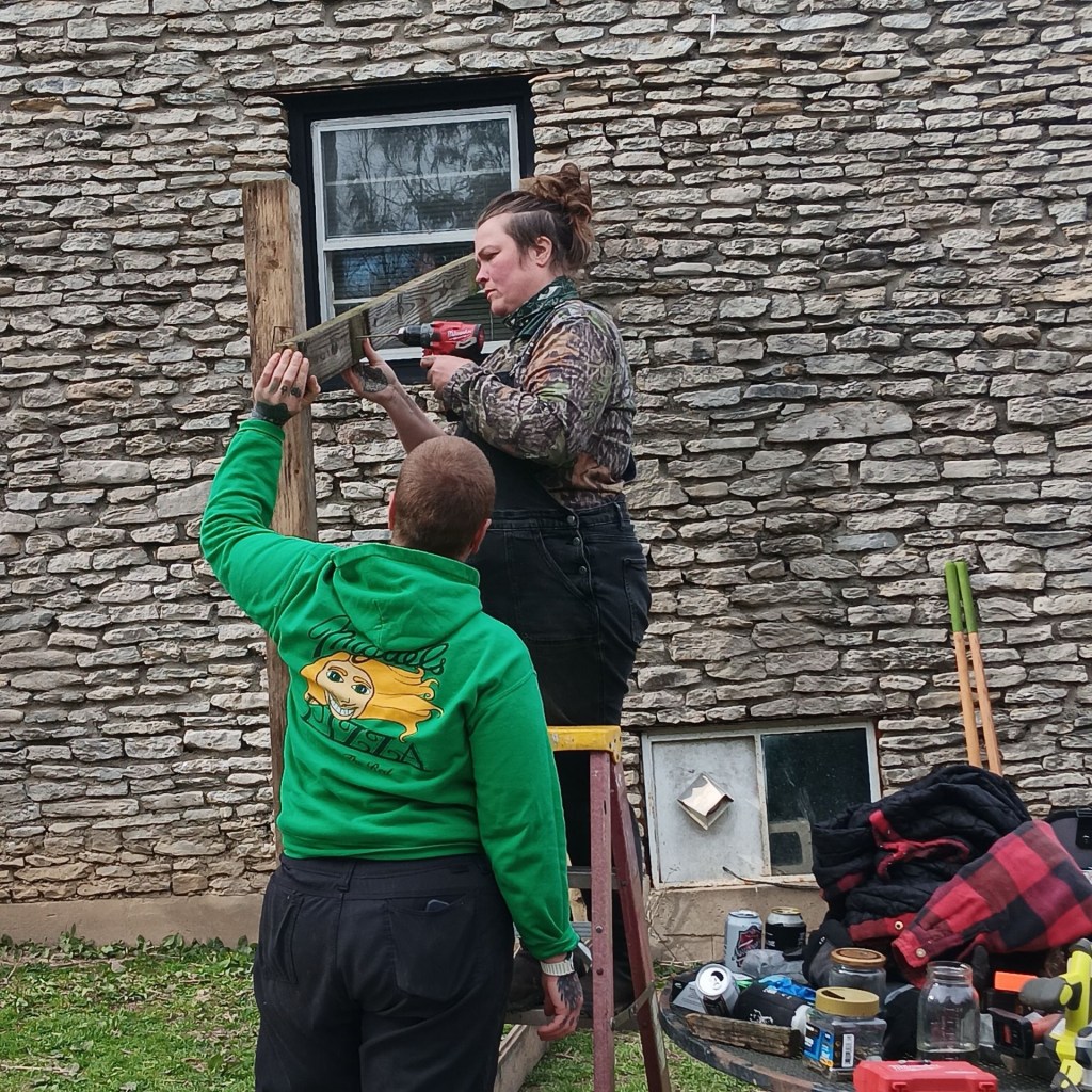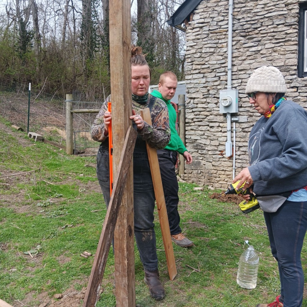 Pride Update: This week we got to help out another pride near Lexington. Their caretakers (and great friends of ours) are building them a catio and asked us to come help out for the day. It is going to be magnificent! By the time we wrapped up for the day, we had the posts set and the frame outlined and secured. I cannot wait to see the finished product!! You will meet Ele and Gibson at Earth Day (Holler Hag) and have a chance to support their pride by snagging one of their beautiful artistic creations made from ethically sourced natural materials.