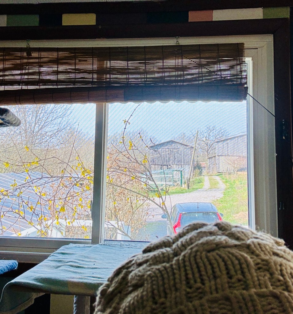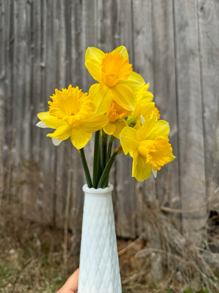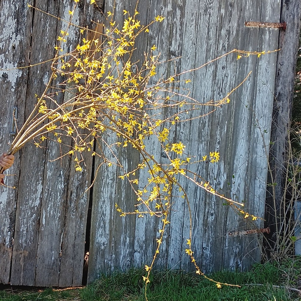 Speaking of forsythia, we will be listing it for preorder this week (probably mid-week, after the 20 degree nights coming up) for the Kentucky Flower Market. Let me take a moment to talk about how awesome they are. We cut a couple of large branches and stuck them in big milk jug cans on the front porch. Both sustained 50 mile an hour winds and look amazing, 3 days in. I laid one of them on the porch for the windstorm and popped it back in the jug when it was over.
